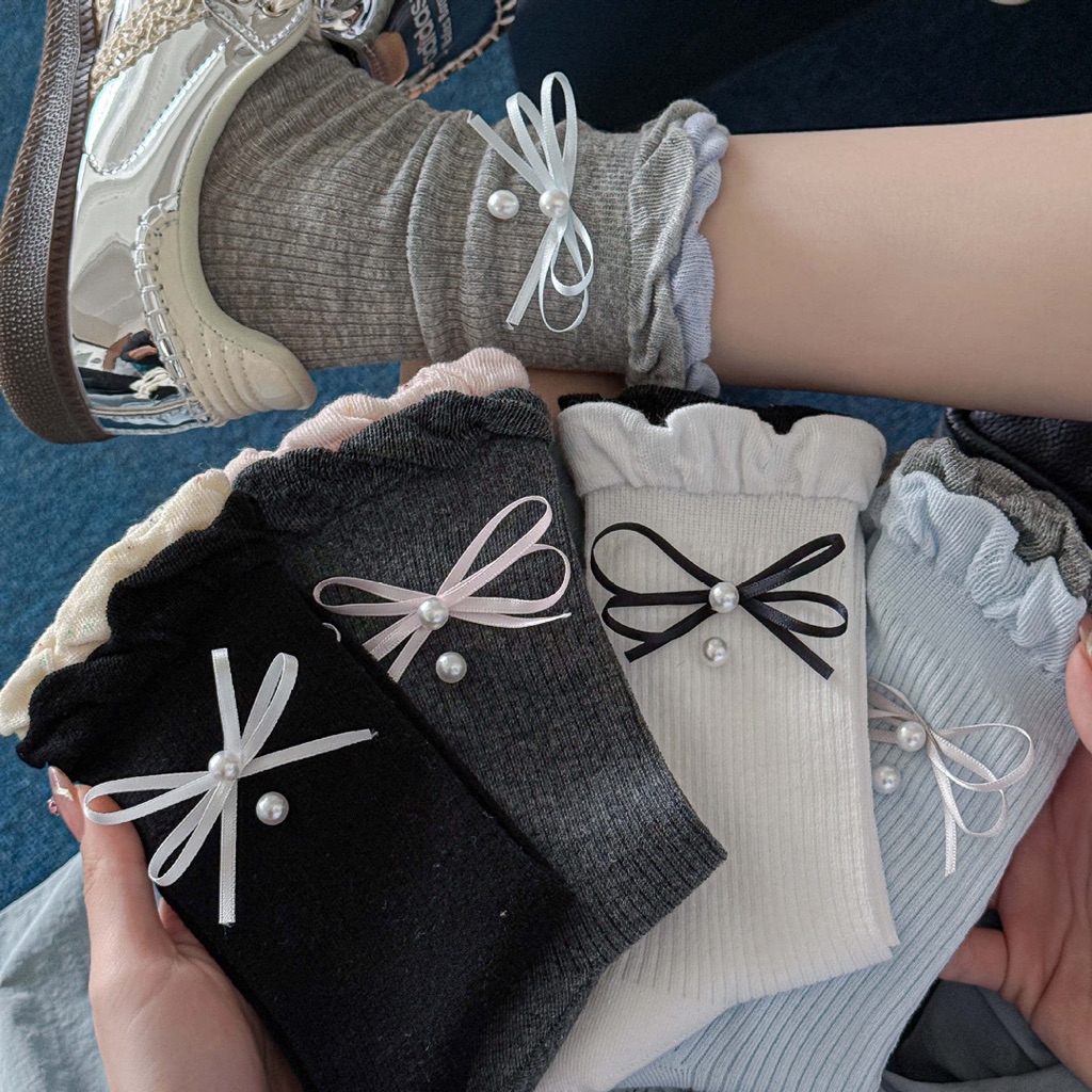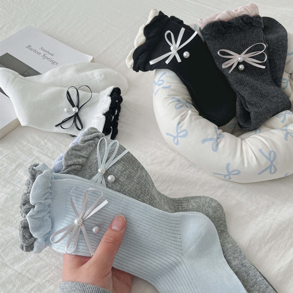韓系甜美泡泡花邊襪 立體蝴蝶結珍珠襪 春夏薄款中筒襪